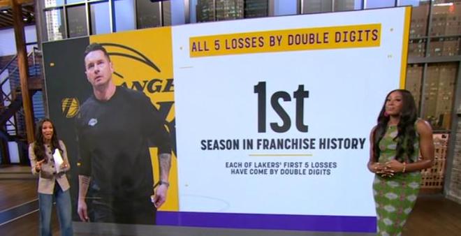 赛后,转播方在节目中复盘了本赛季湖人队的战绩。湖人队在本赛季的5场失利中分差全部上双,这是他们队史上首次出现这样的情况。